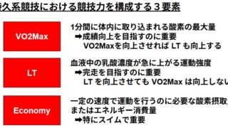 トレーニング理論 持久系競技における競技力を構成する3要素 トライアスロン、OWS、バイクレース、マラソン、等など、持久系競技をやっていると、VO2Max、LT、エコノミー、を伸ばそう、とよく言われますよね。それぞれが何を意味しているのか、どのようにして伸ばすのか、を解説します。VO2Max:最大酸... トレーニング理論